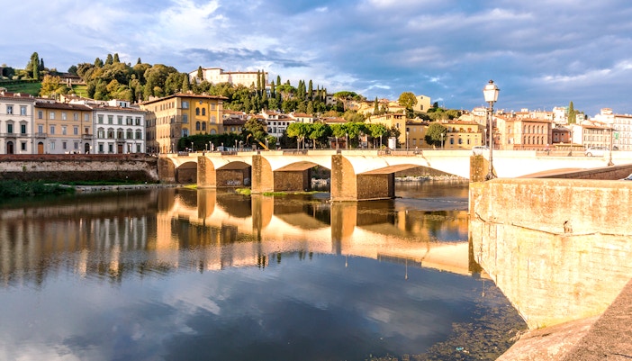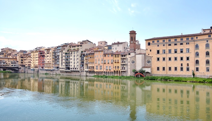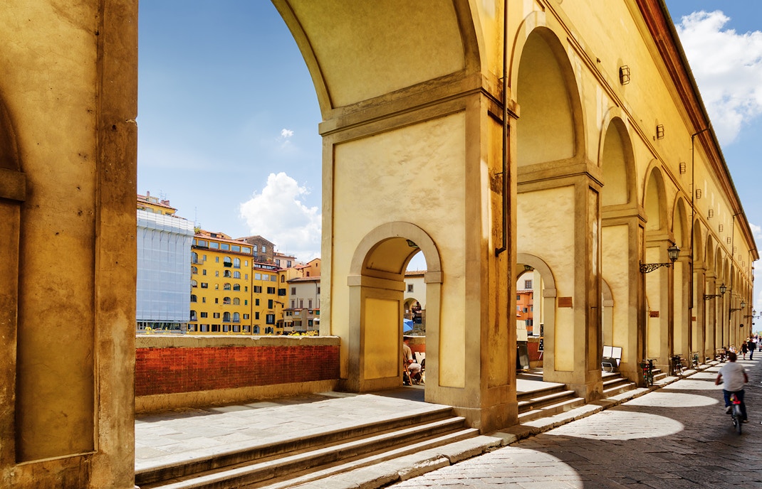 Inizia il tuo viaggio nella prestigiosa Galleria degli Uffizi, che ospita alcuni dei più grandi capolavori rinascimentali del mondo. Il corridoio inizia alla Room D19, passando senza soluzione di continuità dagli interni decorati della galleria alla passerella sopraelevata.