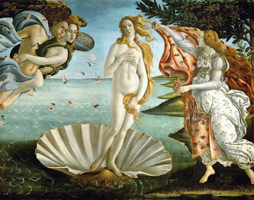 Dit kunstwerk verbeeldt de godin van de liefde en schoonheid, Venus, die op een grote sint-jakobsschelp aankomt op het eiland Cyprus.