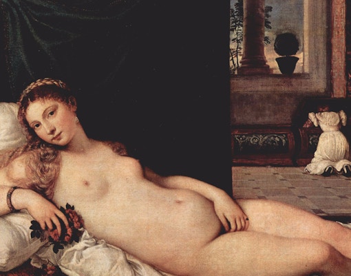 Titiaans schilderij uit 1538, geïnspireerd door Giorgione's Slapende Venus, toont de godin Venus in een verleidelijke pose, starend naar de kijker.