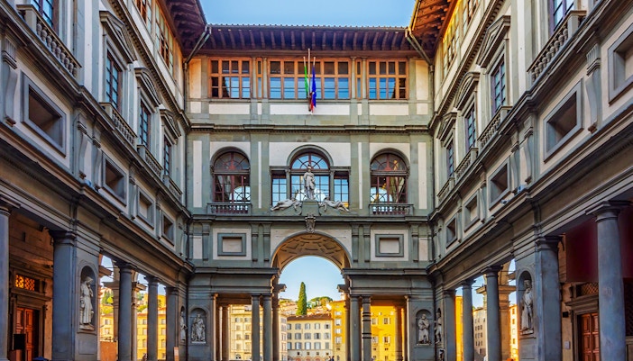 Twoja podróż przez Korytarz Vasariego rozpoczyna się w Galerii Uffizi, jednym z najważniejszych muzeów na świecie. Choć nie jest częścią korytarza, galeria stanowi kontekst dla Twojej wizyty. Wewnątrz znajdziesz dzieła takich artystów jak Botticelli, Michał Anioł, Da Vinci i Caravaggio, odzwierciedlające rozległą kolekcję rodziny Medici i jej mecenat nad sztuką. Dotrzyj na pierwsze piętro Uffizi i udaj się do pokoju D19 w zaplanowanym czasie.